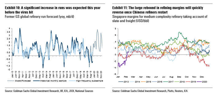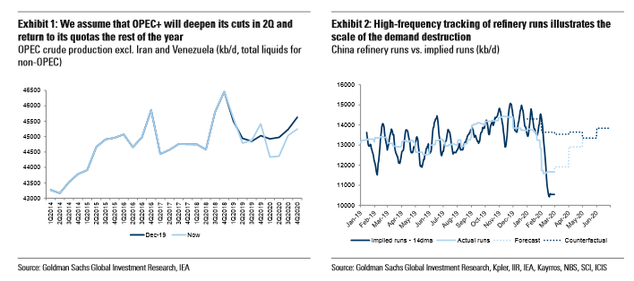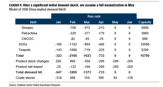 Όπως αναφέρει η Goldman μια σταδιακή ανάκαμψη μέχρι τον Μάιο θα επιφέρει αύξηση της παγκόσμιας ζήτησης πετρελαίου το 2020 σε 0,6 mb / d (εκατ. βαρέλια/ημέρα) έναντι 1,1 mb / d στην προηγούμενη περίοδο και στην παγκόσμια αγορά θα διαμορφωθεί πλεόνασμα 1,0 mb / d (εκατ βαρέλια/ημέρα) το πρώτο εξάμηνο του 2020.
