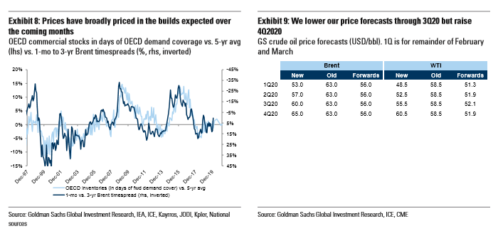 Η Goldman εκτιμά τα αποθέματα παραγωγής της Λιβύης θα παραμείνουν μέχρι τα μέσα Μαρτίου και ότι θα μειωθεί η παραγωγή του ΟΠΕΚ κατά 0,5 εκατ βαρέλια / ημέρα το δεύτερο τρίμηνο του 2020. Οι περικοπές στην παραγωγή θα διατηρηθούν γύρω από τις ποσοστώσεις παραγωγής του Δεκέμβρη , αντί της αύξησης 0,4 εκατ βαρέλια / ημέρα που αναμενόταν αρχικά.