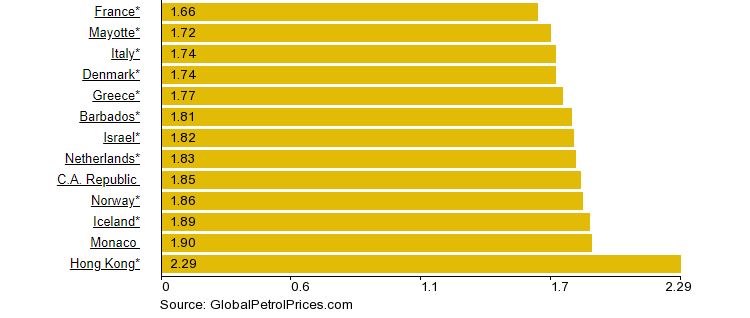 Σύμφωνα με τα στοιχεία του https://www.globalpetrolprices.com/gasoline_prices/ , η Ελλάδα κατατάσσεται στην 9η θέση (με μέση τιμή πώλησης 1,77 δολάρια ανά λίτρο) όσον αφορά στην τιμή της βενζίνης αφήνοντας «πίσω» της παραδοσιακά ακριβές χώρες με πολύ υψηλότερο βιοτικό επίπεδο όπως είναι η Ελβετία (η οποία βρίσκεται στην 21η θέση με μέση τιμή πώλησης 1,59 δολάρια ανά λίτρο) ή το Ηνωμένο Βασίλειο (το οποίο βρίσκεται στην 18η θέση με τιμή πώλησης 1,60 δολάρια ανά λίτρο).
