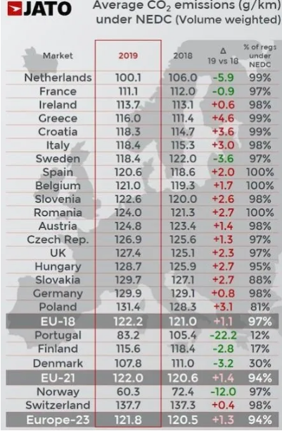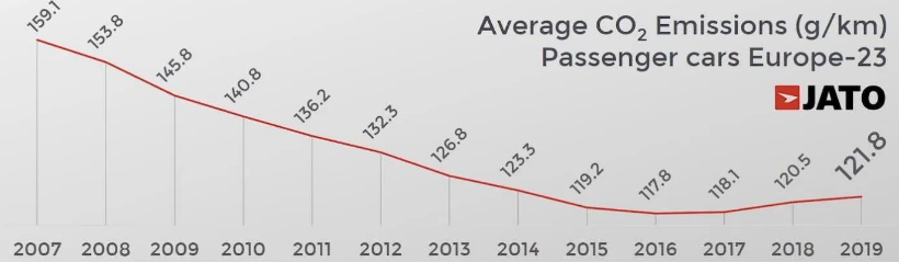 Σύμφωνα με τα στοιχεία της JATO Dynamics, μετά από 11 χρόνια συνεχούς υποχώρησης, ο μέσος όρος για τις αυξήθηκε πέρυσι για δεύτερη συνεχόμενη χρονιά, φτάνοντας τα 121,8 g/km.