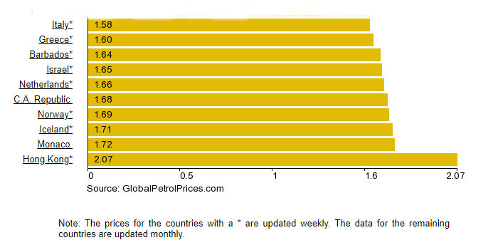 Από τα στοιχεία του ίδιοι παρατηρητηρίου προκύπτει επίσης ότι η μέση τιμή της βενζίνης σε παγκόσμιο επίπεδο βρίσκεται στο 1 ευρώ, με την τιμή της στη χώρα μας να είναι 60% ακριβότερη.